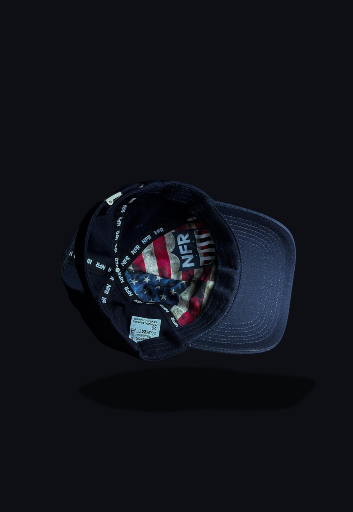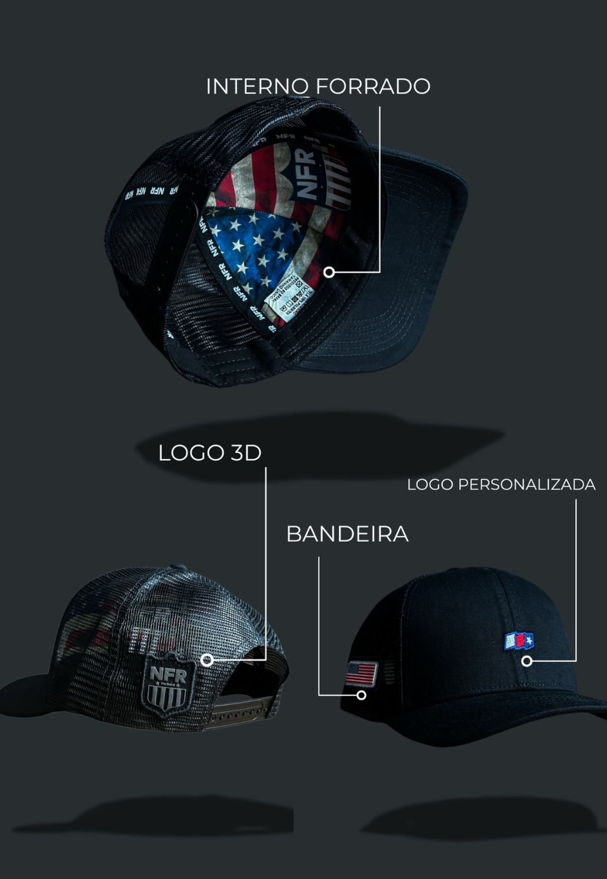 Na lateral, a bandeira dos EUA aplicada com acabamento de alta qualidade adiciona destaque sutil. Na parte frontal, a logo NFR pequena garante toque discreto, elegante e cheio de autenticidade.